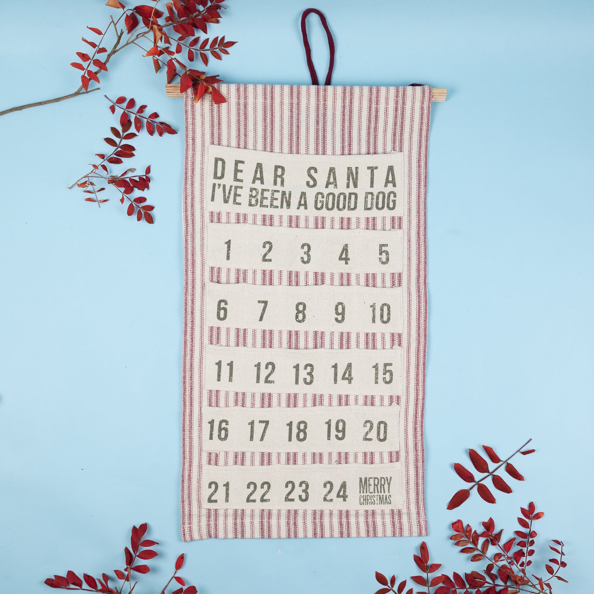 A cotton wall countdown displaying a rustic holiday stripe pattern with a fun dog inspired seasonal sentiment that reads "Dear Santa - I've Been A Good Dog." Our Good Dog wall countdown features 25 pockets perfect for placing treats or ornaments to display the days left until Christmas. Christmas countdown is easy to display via the cotton tape hanger attached to the top. A fun pet-themed home accent perfect for counting down the days to Christmas.