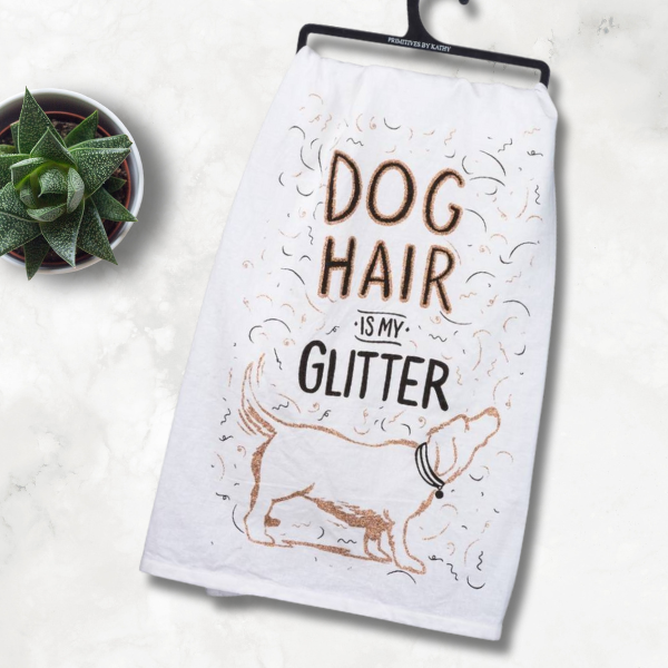 A cotton kitchen towel lending "Dog Hair Is My Glitter" sentiment, dog and floating fur designs, and rich-pigmented glitter accents. Great for gifting for dog moms to make for special kitchen décor.