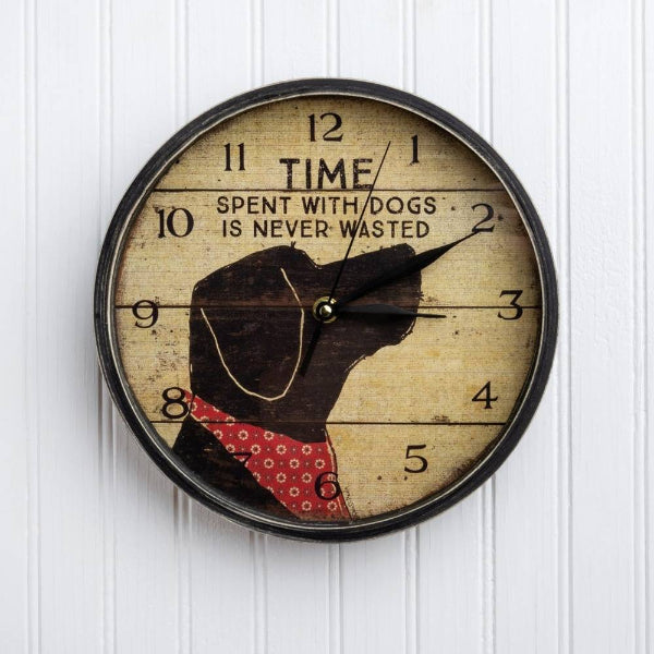 A slat wood clock distressed with "Time Spent With Dogs Is Never Wasted" sentiment, dog silhouette design with red bandana accents, and metal hands.